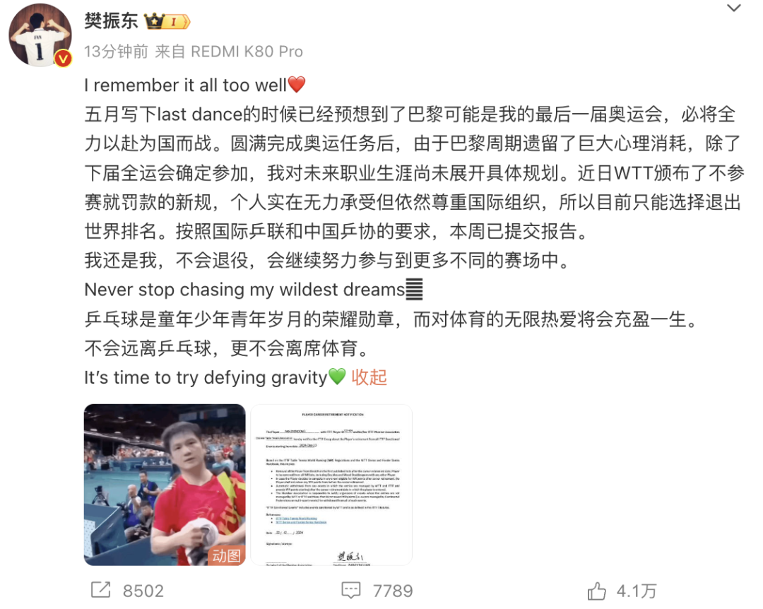 樊振东还在文中还提到,自己不会退役,会继续努力参与到更多不同的赛场中。